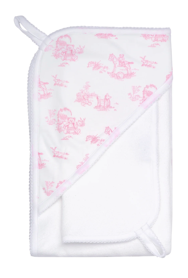 Our Toile Hooded Towel set is made of 100% Peruvian cotton. The hood has a pima cotton applique made of pink Tolie fabric.