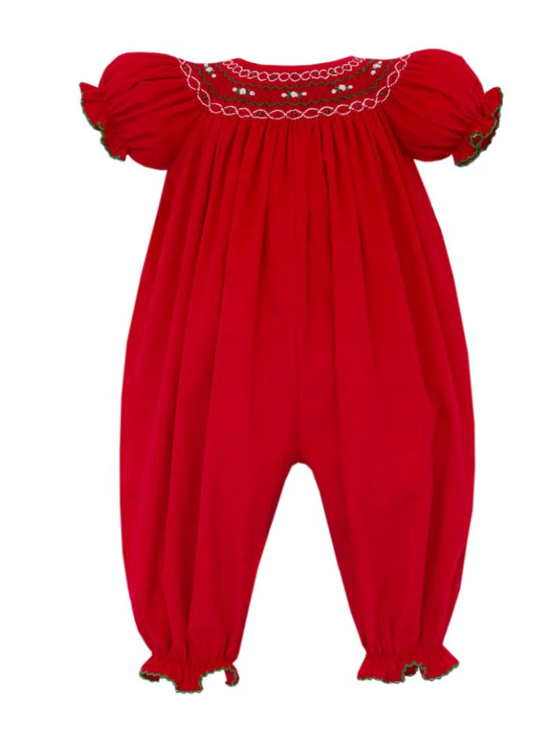 Red Corduroy Smocked Christmas Romper - 18M is backordered and will ship as soon as it is back in stock.