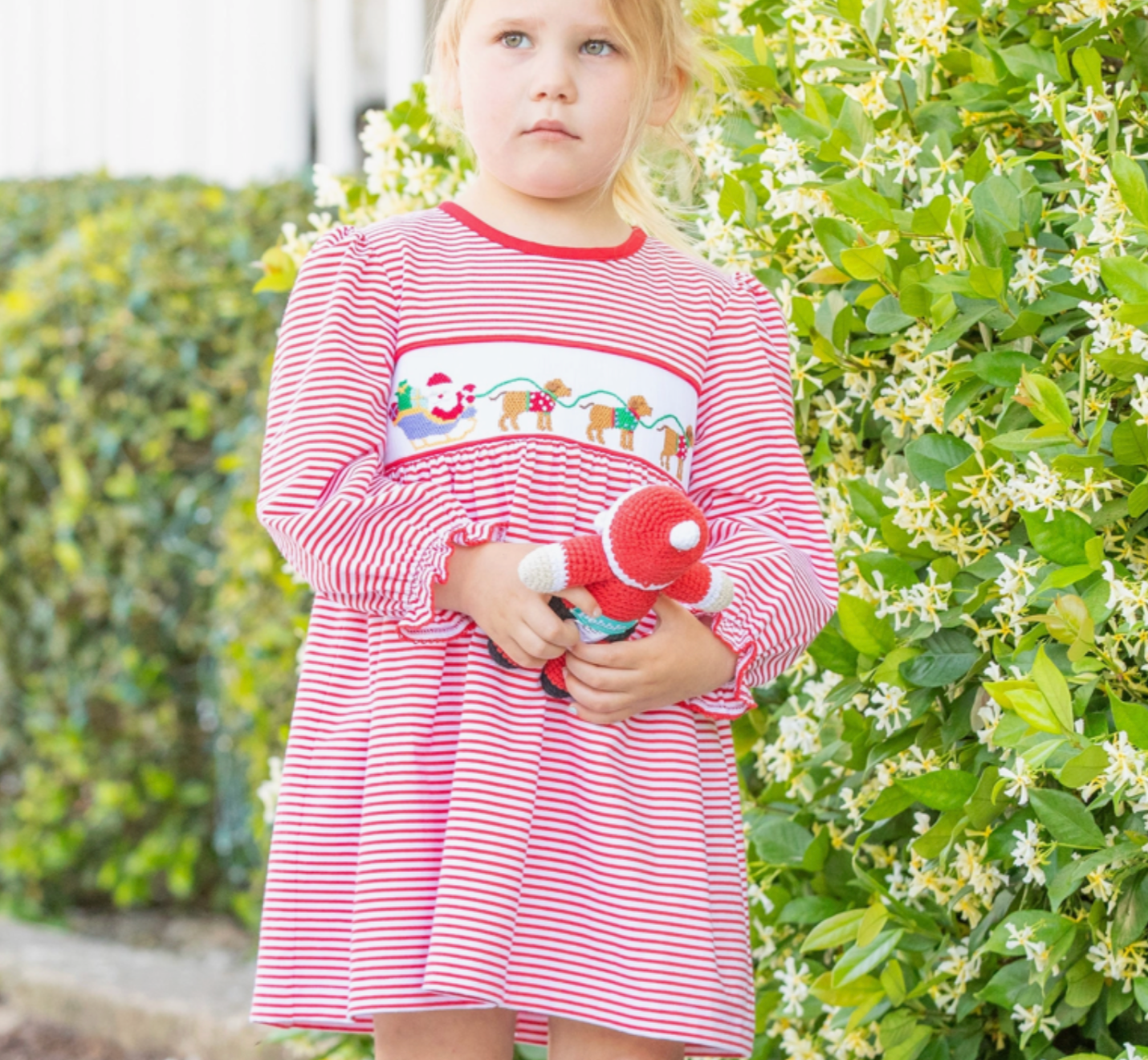 Does she recall the most famous reindeer of all? She probably does, but she surely will love this different take on Santa's sleigh in our adorable classic style, long sleeved hand-smocked Girls Smocked Dress-Santa Dogs by Shrimp and Grits Kids! The soft red and white stripe cotton fabric with red trim around the neckline, red picot trimming the ruffle sleeves and the sweet hand-smocking of a vintage Santa with his sleigh of toys being pulled by three puppy reindeer, all creating a delicate, retro look! Perfect for a winter day of play or for Christmas dress up occasions. And with our Santa Dogs collection her sibling will match, even the baby! Perfect for that Christmas photo opp!