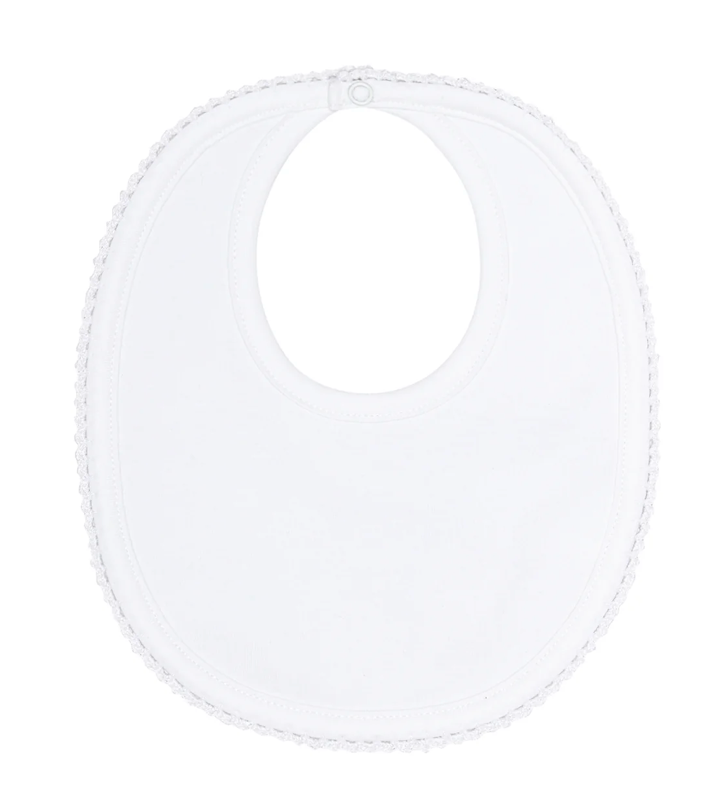 Elevate your baby's mealtime with our Crochet Blue Baby Bib, crafted from the finest pristine white Pima cotton. This bib offers exceptional softness and durability, ensuring it remains gentle on your baby's delicate skin while standing up to daily use, and the handmade crochet trim around the edges enhances its overall appeal