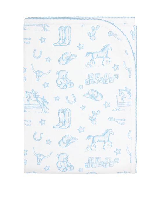 This beautiful blanket is as soft as it is memorable. Made from luxurious Peruvian Pima cotton, it showcases our Lone Star Toile print — a tribute to Texas icons like cowboy hats, teddy bears, and horses. Lightweight yet cozy, it’s perfect for swaddling, snuggling, or gifting. Finished with scalloped trim, it's a standout in any nursery.
