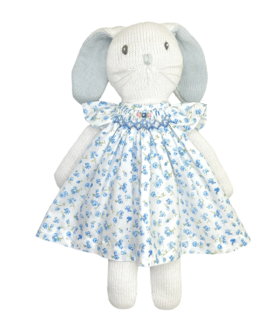 This hand-knit Easter bunny doll comes with an adorable short sleeve blue floral print dress with smocking and a sweet embroidered flower on the front.