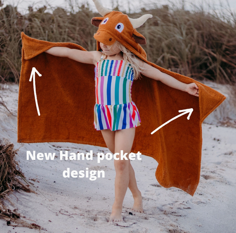 Longhorn hooded towel I moved to Texas and of course I had to add a Longhorn towel! The longhorn is a very cool looking and well loved animal here and I'm on board with having it my new favorite animal! Whether you are a Texan, or just a unique animal lover, this is the towel for your little one. While he has the pointy horns, he's crafted from soft 100% cotton terry and is pretty happy and cuddly, and a NEW feature, this has little hand pockets to hold on to. Hook em' horns! -Machine wash -Towel size 27"x51", hood size 10"x 8.5" -Suitable for children ages 2 -8yrs -100% cotton -small pockets on top corners for little hands to easily hold the towel when wearing. -Made in TX